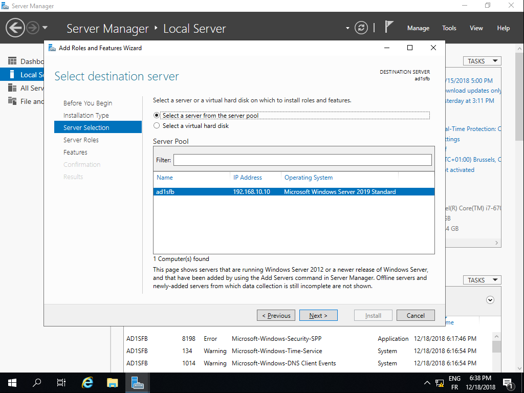 Sélectionnez le serveur où vous souhaitez installer le rôle AD puis cliquez sur “Suivant”.