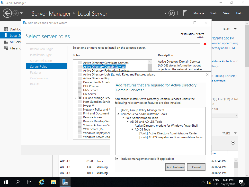 Le rôle à choisir dans la liste est le suivant : “Services AD DS”. Les outils de management arriveront en même temps que l’installation du service.