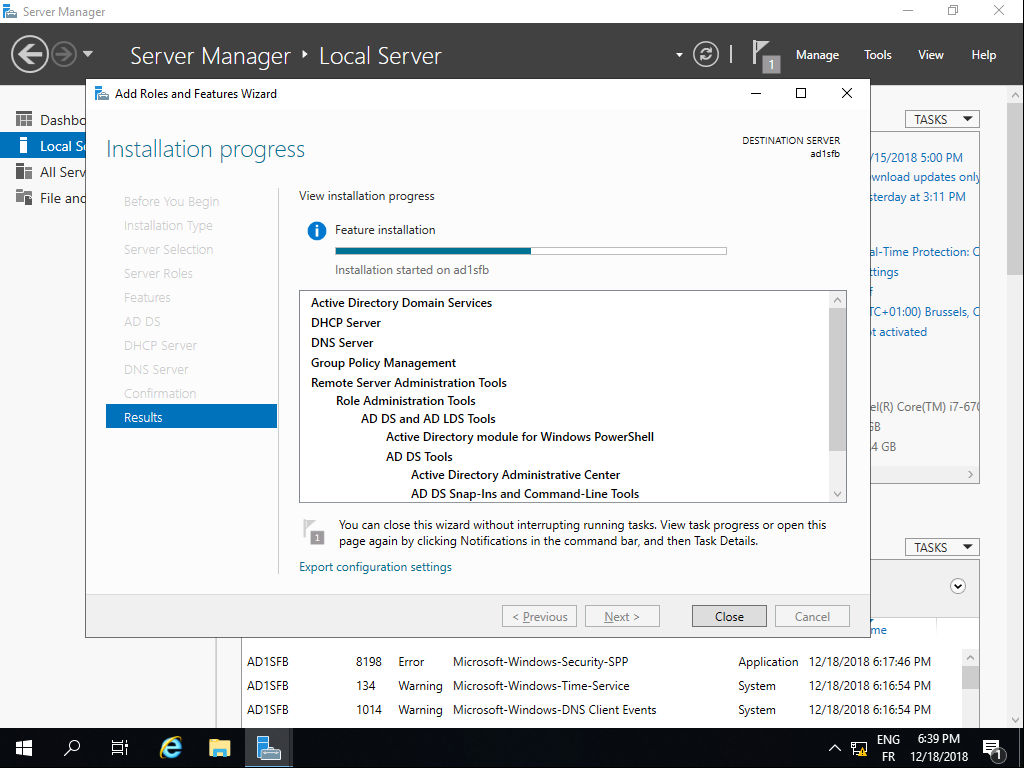 L’installation va s’initier juste après la sélection des rôles. Ne redémarrez pas le serveur immédiatement après l’installation.