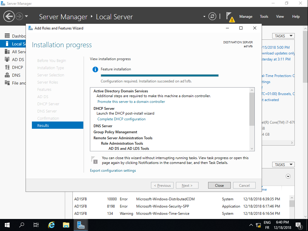 Une fois l’installation OK, un lien de configuration apparaîtra dans la fenêtre d’installation > “Promouvoir ce serveur en contrôleur de domaine”. Cette option transformera votre serveur en véritable infrastructure de domaine.