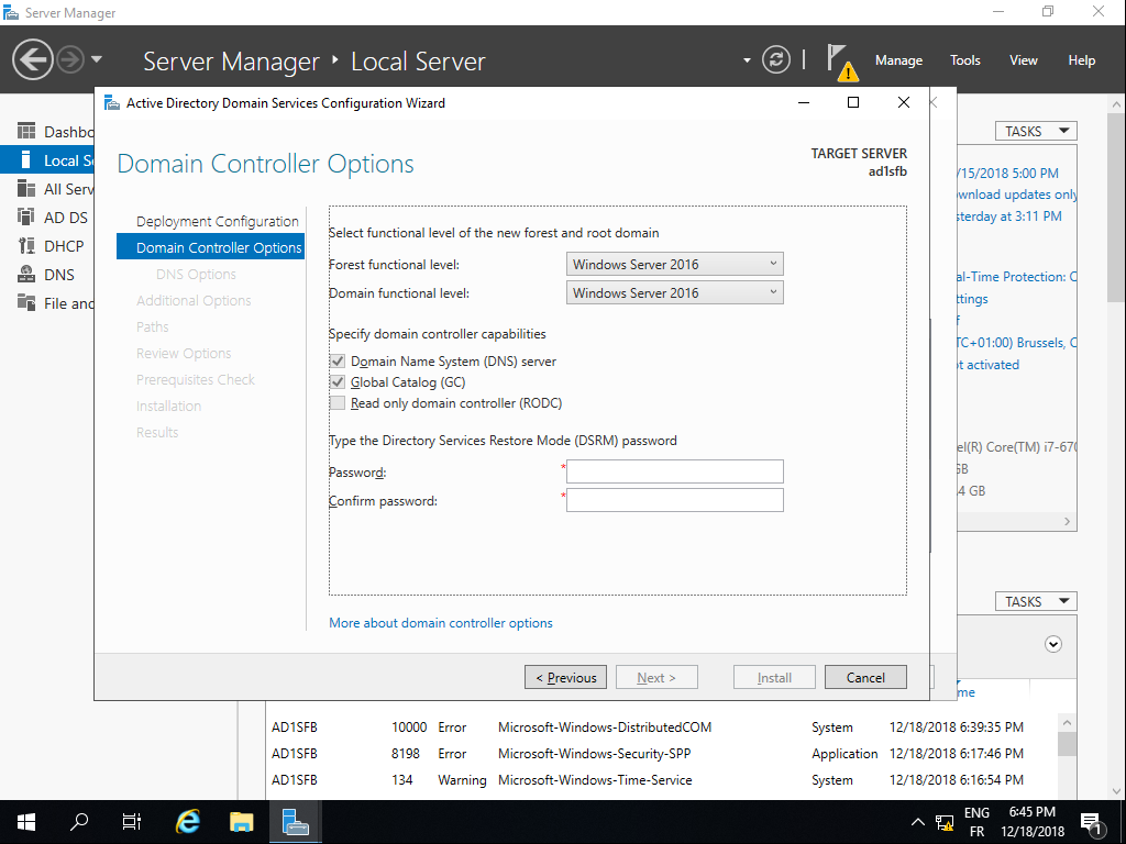 Par la même occasion, vous devrez y saisir le mot de passe de restauration de l’AD (DSRM) – ce mot de passe vous sera demandé lorsque vous ferez une restauration de l’AD vers d’autres serveurs (notamment lors des backup/restore via un système tiers).
