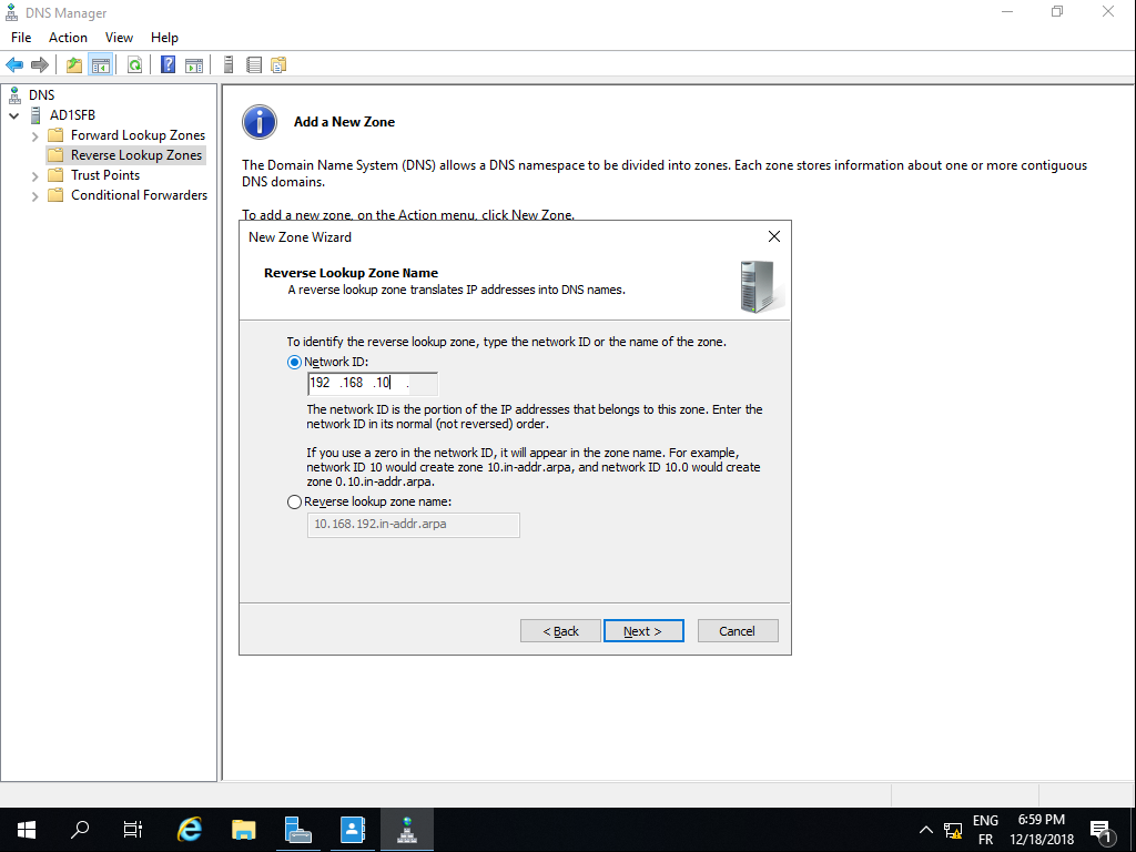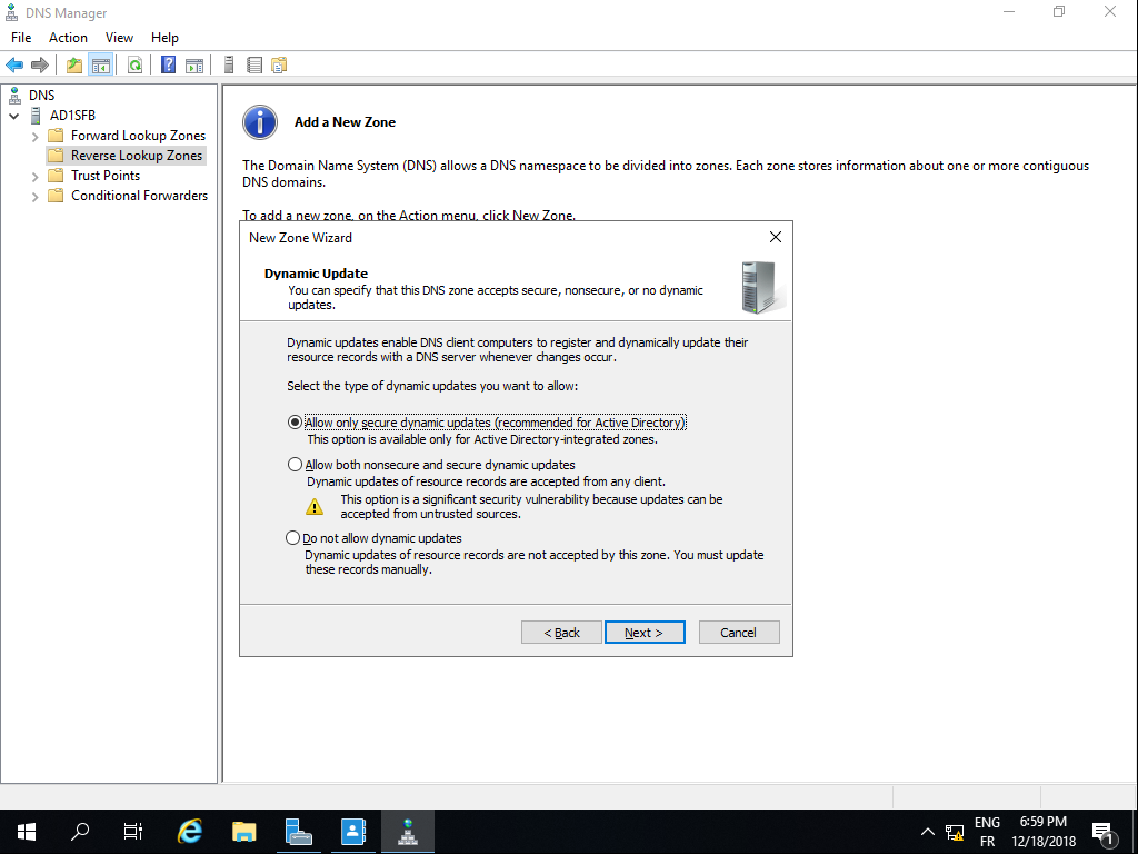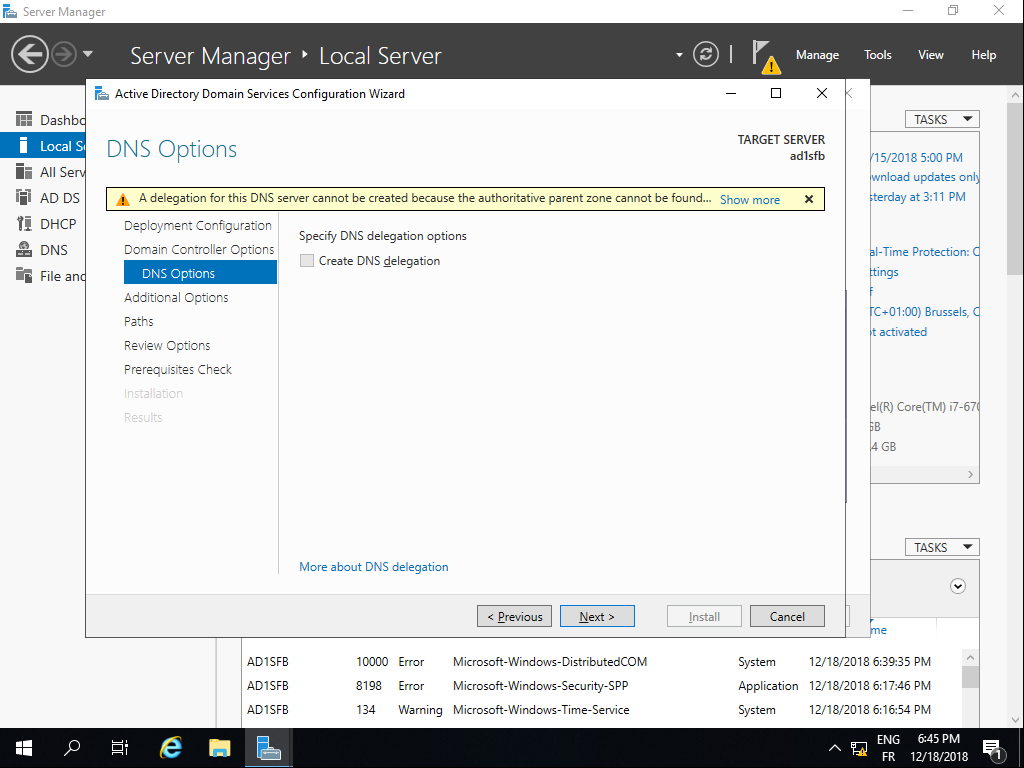 La délégation DNS est utilisée lorsque vous disposez d’un autre serveur DNS sur le réseau, voir même un autre AD. Ainsi, ce serveur serait en mesure d’ajouter des enregistrements DNS sur les autres serveurs DNS du réseau et faire partie des serveurs DNS répondant sur le réseau pour les clients, assurer une redondance etc… Ce ne sera pas notre cas pour l’instant.