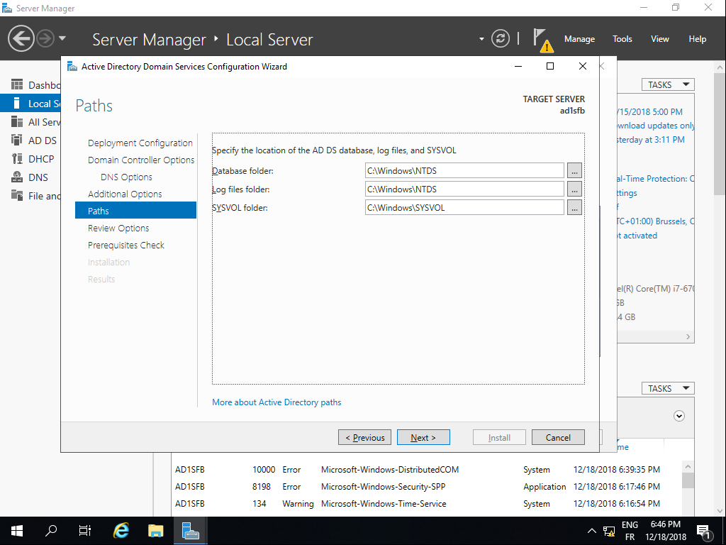 Les emplacements définis automatiquement sont à retenir – les fichiers de configuration de l’AD et autres données nécessaires au bon fonctionnement du service se trouveront à ces 3 endroits. Vous pouvez modifier les emplacements, mais attention à la sécurité à mettre en oeuvre par la suite.