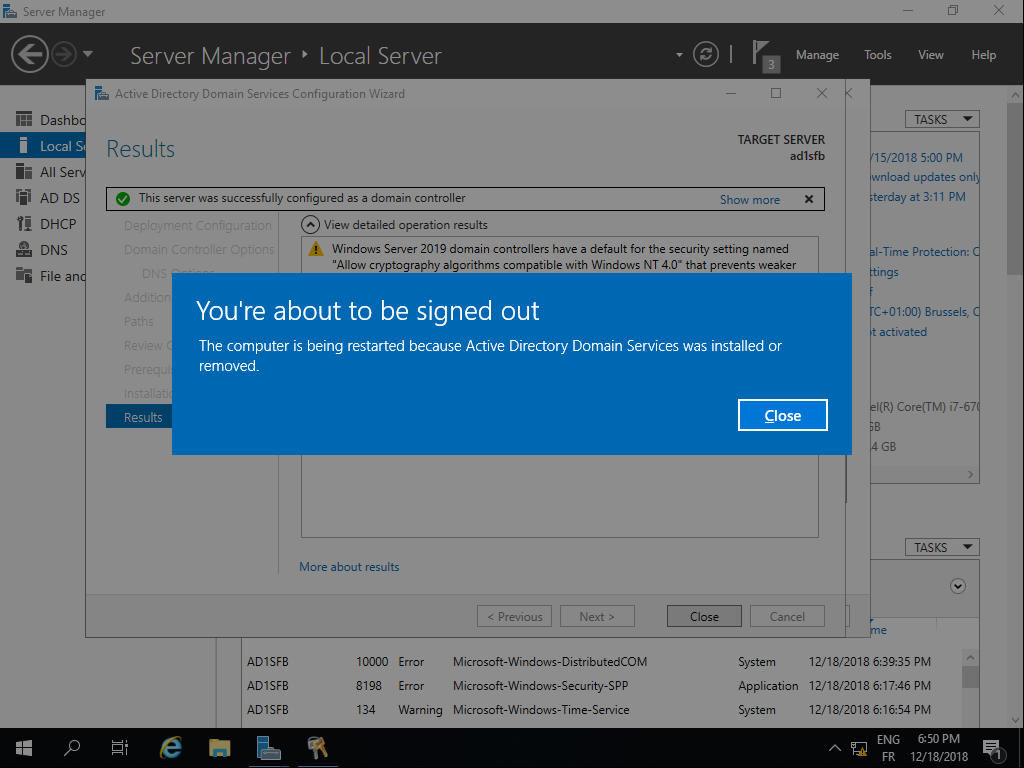 Quand l’installation se terminera, le serveur va redémarrer automatiquement – Vous pourrez alors vous connecter avec le compte Administrateur (et le mot de passe associé) sur ce nouvel AD !