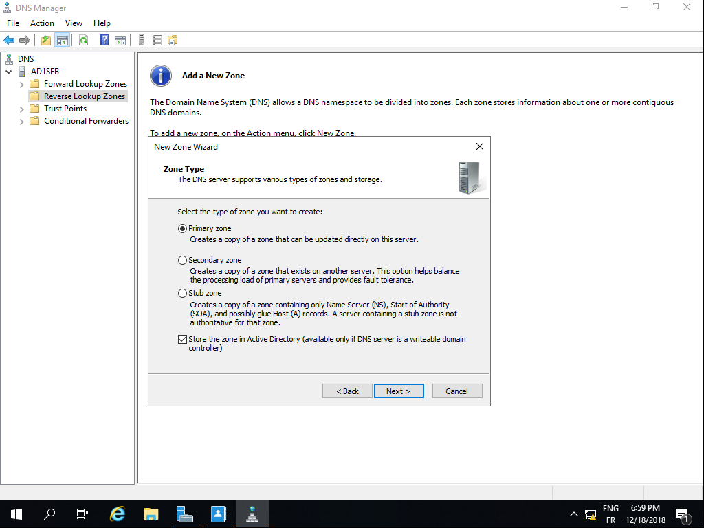 Pour se faire, faites un clic droit sur “Zone de recherche inversée” puis sur “Ajouter une nouvelle zone” . Sélectionnez l’option “zone primaire” et vérifiez que l’option “Stocker la zone dans l’Active Directory” est bien cochée.