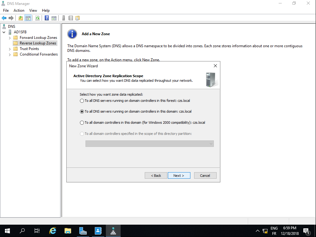 La zone se créant, une nouvelle option vous sera demandé : faut-il propager la zone de recherche inversée aux serveurs DNS d’une forêt AD, au domaine AD ou aux serveurs de domaines ?